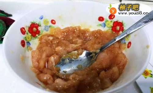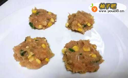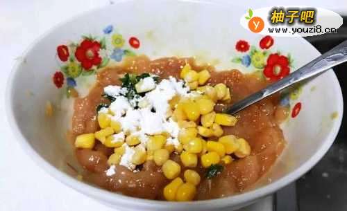 3鸡肉腌完后,加入生粉、葱末、玉米粒,搅拌至黏稠状