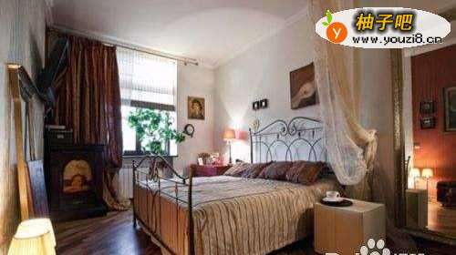 4欧式的床,很简约;米色纱帐帷幔,很写意;深红色窗帘,很魅惑;暖暖浅黄色的氛围,很温馨!