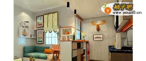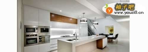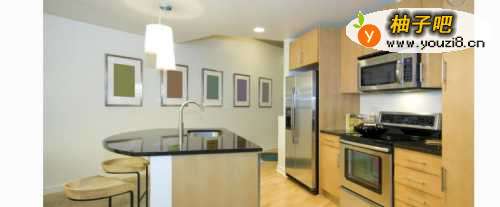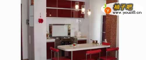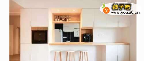 4如果房间没有原来厨房,可以参考下图的装修形式,找适合放橱柜的一面墙装修成橱柜的方式,同时可以设计成即是橱柜又是吧台的形式,很受用的。