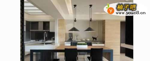 2如果房间面积比较小,可以隔成半开放式厨房,如下图所示,将厨房用半面墙壁隔开,让厨柜面对餐桌敞开设计,这样即节省空间,又显得开放。