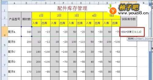4当有了基本数据后,便可以计算出实际的库存数了,在M4中输入公式“=B4+SUM(C4:L4)”。这里SUM是求和函数,表达式是:SUM(number1,number2,........)