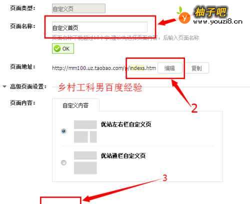 5点击加号添加新的自定义页面,设置页面名称“自定义首页”(名称可以自己随便定义,但是不能与现有的页面名称重合),同上对页面的地址也可以自定义。最后点击“保存”。
