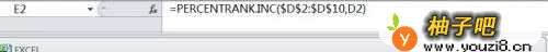 3这时,需要在编辑栏中输入公式:=PERCENTRANK.INC($D$2:$D$10,D2),如下图所示。