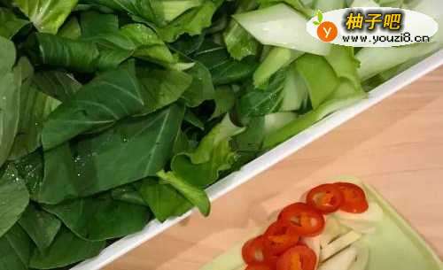 2青菜切段,菜梗与叶片分开,蒜头和辣椒都切薄片
