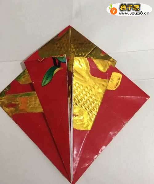 8第八步 带出来一个角之后 折倒压平 然后再把其它三个角按同样的方式步骤向上折倒 每一个角与角对齐