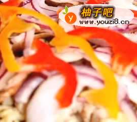 7先倒入芝士,炒好的鸡肉,各种蔬菜,然后放入预热好上下火220℃的烤箱,烤12分钟左右,直到面饼呈黄色即可出炉。