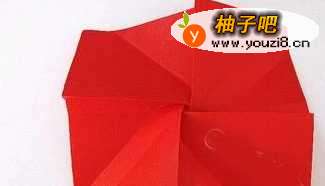 9将此时的折纸模型翻转过来,就得到了如图所示的样式。能看到这样的样子在折纸玫瑰教学方形折纸玫瑰制作教学的制作过程中也同样出现过。能看出来他们的折法在后面都是采用着相同的原理和方式。