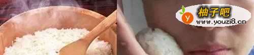 4对于去黑头比较有经验的朋友往往会选择用热米饭揉成团然后在黑头多的地方轻轻滚动,利用米饭的粘度就会比较容易把黑头吸出来。