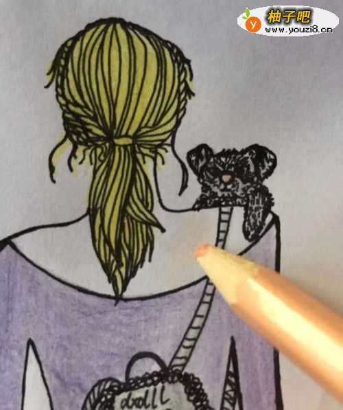 4肤色彩铅给女孩子的皮肤上色,灰色彩铅给双肩包上色。紫色彩铅覆盖薰衣草色彩铅,加深装扮的颜色。