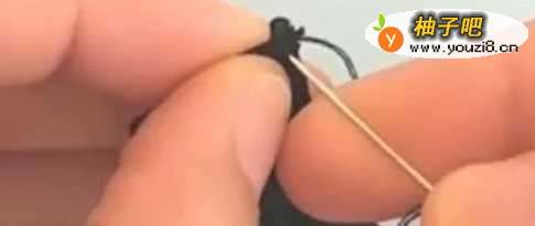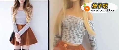 5裙子用一张长方形的布料,在裙子最上边缝进一条线,拉着绳子两边挤压布料,裙子会出现褶皱的样子,调整褶皱,绳子顺着娃娃的腰缠上,系好,多余的能剪掉。