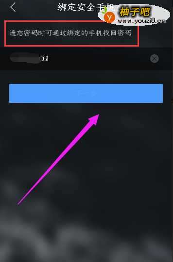 7然后,弹转到这个页面,要求你绑定安全手机号,这样的话有助于帮助你忘记了,能找回来,如图所示