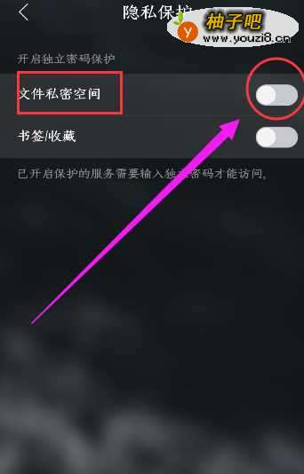 6进入隐私保护,你将会看到有个文件私密空间的选项,将后面的开关开启,如图所示