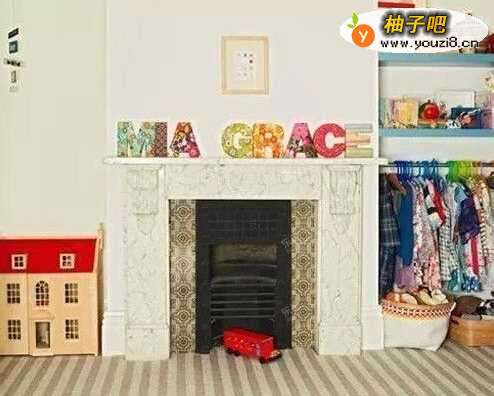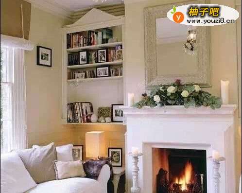 壁炉的设计通常都是突出一块,所以两边自然就会凹陷下去。在壁炉与墙面之间特制一个书架,用来收纳图书,然后再空余的空间里放上一些装饰品或者相框,让你又增加了一个功能。