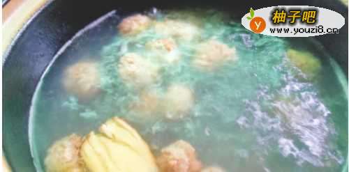 首先拍一个姜,将油炸的肉丸子放入锅中,烧开。