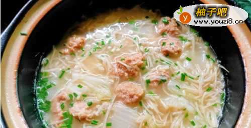 今天要介绍的是一个适合养生和美味的汤菜---金针菇白菜肉丸汤。