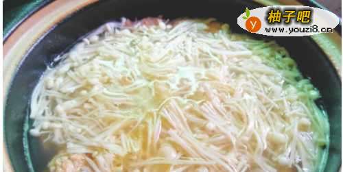2放入洗净的金针菇,大火煮至金针菇熟透。