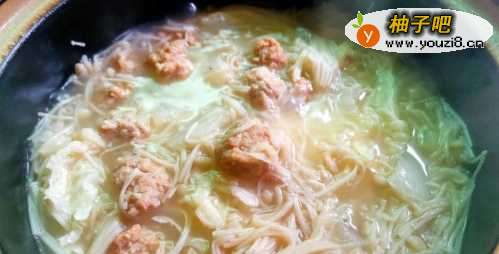 6起锅,一锅香喷喷的既好喝又养生的金针菇白菜肉丸汤就做好了。