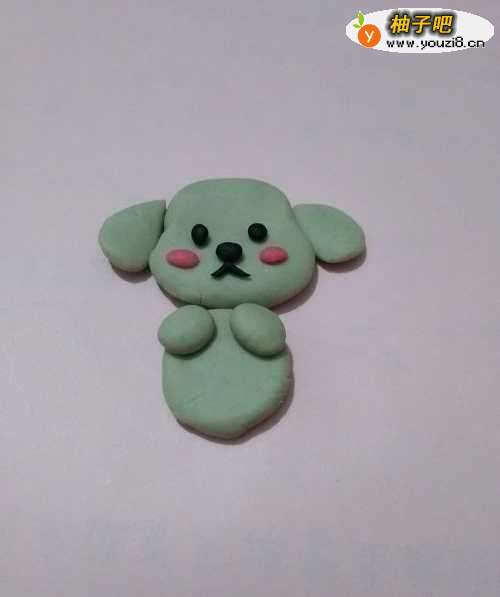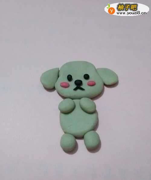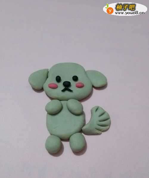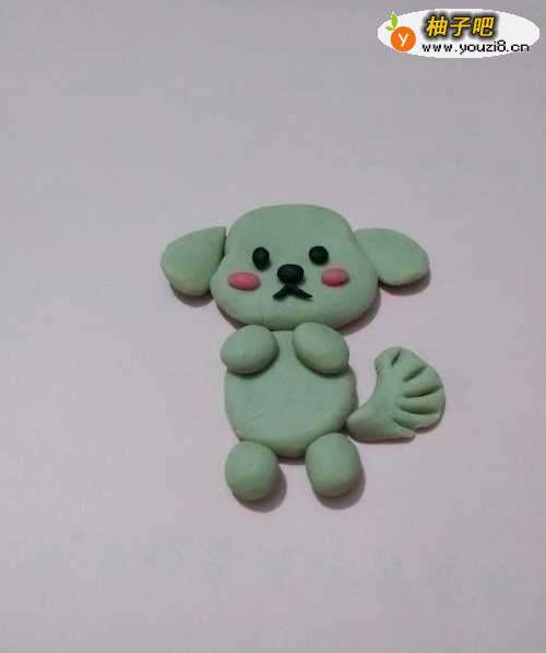 10再用白色捏两个小的椭圆形,粘在身体下面,当作小狗的两条后腿。