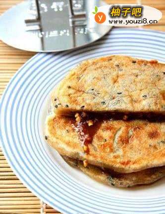 4锅中放少许油,放入包好的糖饼,用压饼的小模子不断的按压饼,然后反面