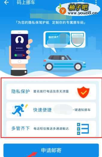 4启用后,能看到制捕颂作挪车码的好处,能保护个人隐私等,接着点击箭头指的“申请邮寄”按钮,申请相关套件。