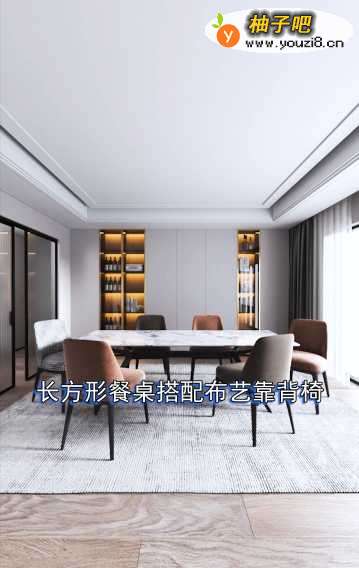 2智可以弹动门,时尚又好用,长方形餐桌搭配布艺靠背椅。