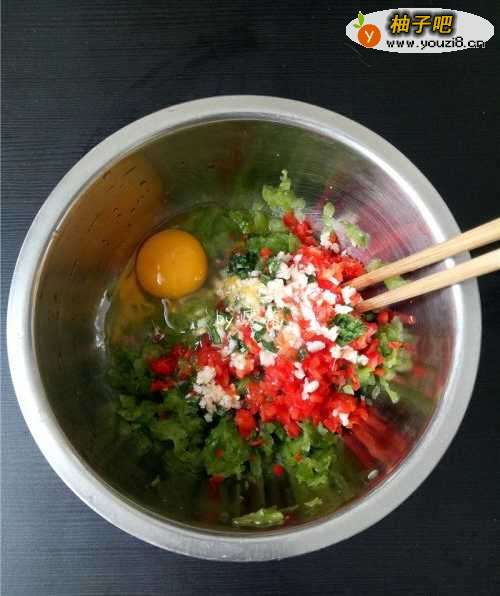 6苦瓜里调入鸡蛋,甜椒,大蒜,葱末;用筷子搅拌均匀;调入盐,白糖,胡椒粉,料酒,再次搅拌均匀;