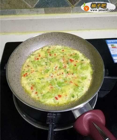 8用小火将苦瓜蛋液煎至凝固;