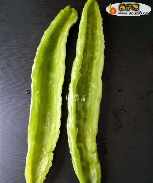 2苦瓜对半剖开,用勺子挖掉苦瓜籽,苦瓜瓤;苦瓜里的白色的物质一定要挖干净,否则会发苦;将苦瓜切薄片,尽量薄;