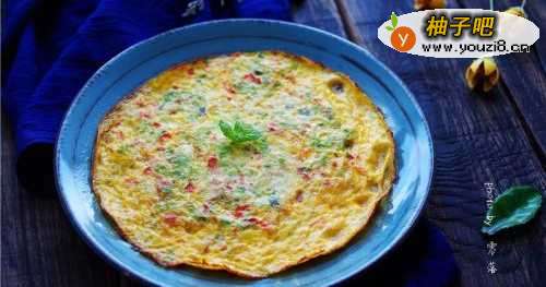 7平底锅里倒入适量橄榄油;倒入苦瓜蛋液,借助铲子将食材铺均匀;