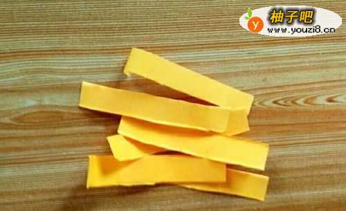 2取出剪刀,用剪刀沿着彩纸折叠的折痕,把彩纸剪成一条条的小纸条。