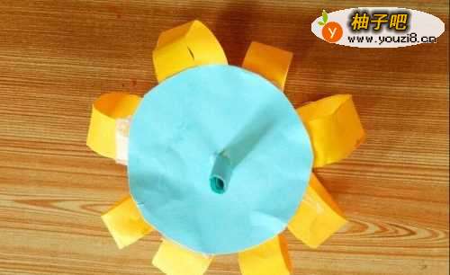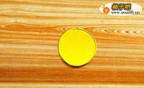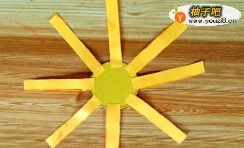 6分别把所有纸条的两端涂上胶水或者粘双面胶。然后把这些纸条均匀的粘贴在黄色的圆形纸片上。