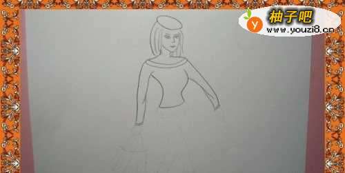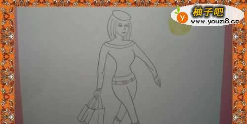 2接着,用黑色彩铅笔画女生的身体和腿脚出来,注意腿脚的高度与身体的比例关系,如下图所示。