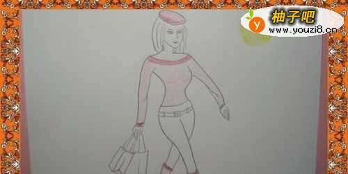 用铅笔在白纸上画出整个画面的草图,一个在中秋节超市商场里购物,准备过中秋的女生,手上提着给自己的心爱人的礼物。接着用黑色彩铅笔画出女生的头部和五官、手臂出来,如下图所示。