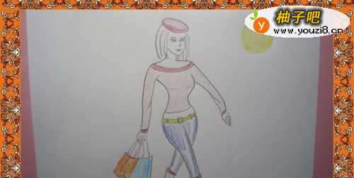 6最后,用深蓝色彩铅笔给女生的裤子涂上颜色,头发涂上黑色。购物袋涂上蓝色和橙色。故事彩铅画之中秋购物的女生就画好了,如下图所示。家长可向孩子提问,女生在买啥呢。
