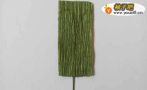 将铁丝粘在两片长方形的绿色纸中间。