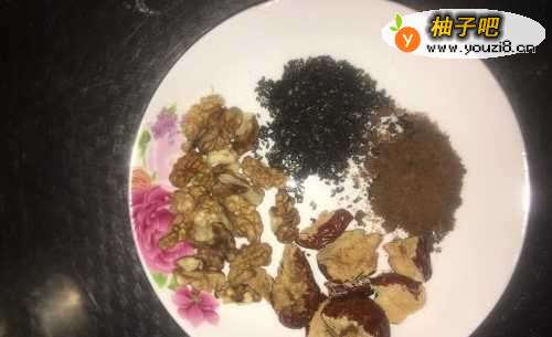 2豆浆机中加入10克黑芝麻,再加入适量去核红枣、核桃仁,适量红糖。