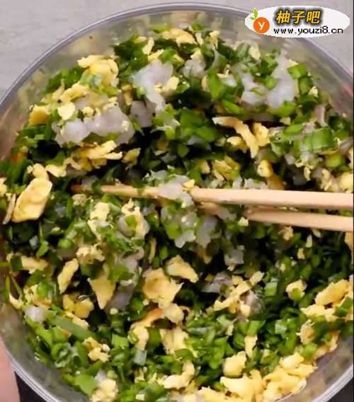 2将韭菜切碎,加入鸡蛋、肉末、盐、料酒、生抽、味精等调料,搅拌均匀