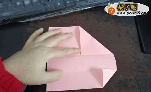 5把上侧的边向下折,并且折到里边去,继续向下折一次,如图所示。