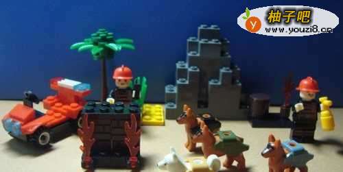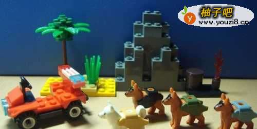 4然后,取出四个拼装好的小狗积木,放在小山积木的前面,摆放的位置,如下图所示。