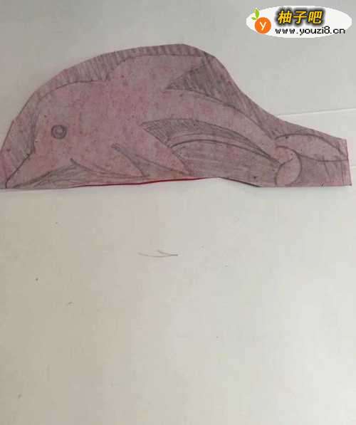 6第六步 剪完外围多余的彩纸之后 再剪出它的眼睛 嘴巴 胸鳍 背鳍 尾鳍 肚底处的镂空部位等等 都剪好之后 展开压平 一对可爱的小海豚就裁剪完成了