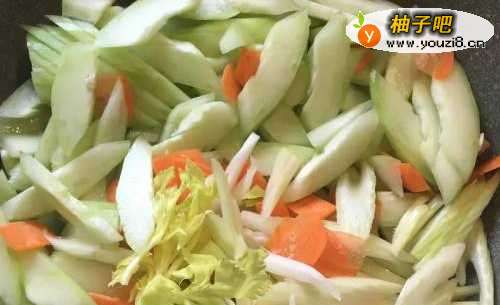 4放入大黄瓜、西洋芹、红萝卜翻炒几下,加入半米杯的水