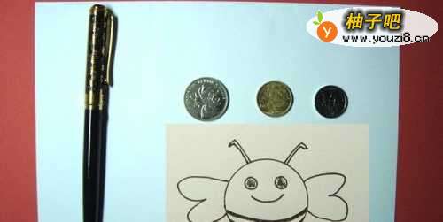 在画简笔画时,圆形比较难画,这能用一枚硬币来画个圆,这样在圆基本形状上进行添加线条或图形就能画出很多好看的图形了。这里给大家分享用硬币画简笔画,一个可爱的小蜜蜂,大家也来画画吧