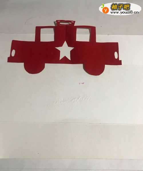 6第六步 剪完外围多余的彩纸之后 再剪里面细致一些的部位 大灯 五角星 车窗玻璃大灯和每一个涂实的部位 都剪完之后展开压平 一辆酷酷的警车就裁剪完成了