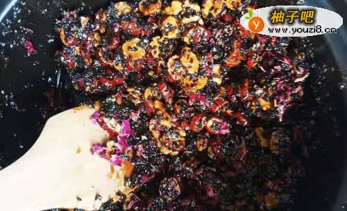 5加料:等挂旗状态比较好之后,温度调至300度或者换成小火,依次加入辅料,先加入核桃仁搅拌均匀,再加入红枣搅拌均匀,再加入枸杞或者玫瑰搅拌均匀,最后加入黑芝麻搅拌均匀后;顺序是大颗粒先放,小颗粒的后放;全部加入以后,再熬制几分钟,搅拌均匀后放入容器内。