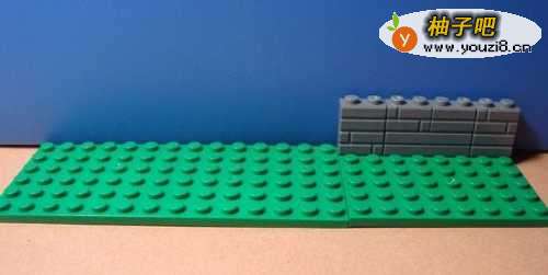 2这里找出一个绿色底板的积木,并安装好六个围墙积木,摆放的位置,如下图所示。