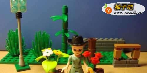 5接着,取出一个拼装好的路灯积木,作为公园的背景部分,并摆放两个花朵的积木,摆放的位置,如下图所示。