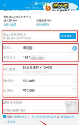 7选好航班之后,下面就是一些订单信息的选择,包括选择乘机人、联系人信息、保险、邮寄凭证等,,选好之后去支付就能了。