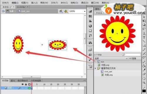 8在“库”面板中复制“root_sun”取名为“root_sun副本”,将“root_sun副本”拖到舞台中,“实例名称”取名为“root_sun2”。