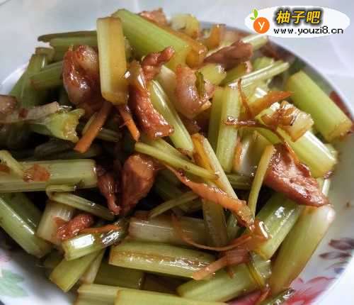 7放入芹菜,翻炒。这一步将芹菜吵到八九分熟。