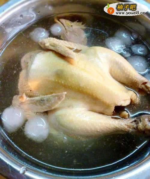 3鸡肉煮好后捞出泡进冰水里,等鸡肉温度完全冷却后捞出沥水,在鸡肉表面刷上适量麻油